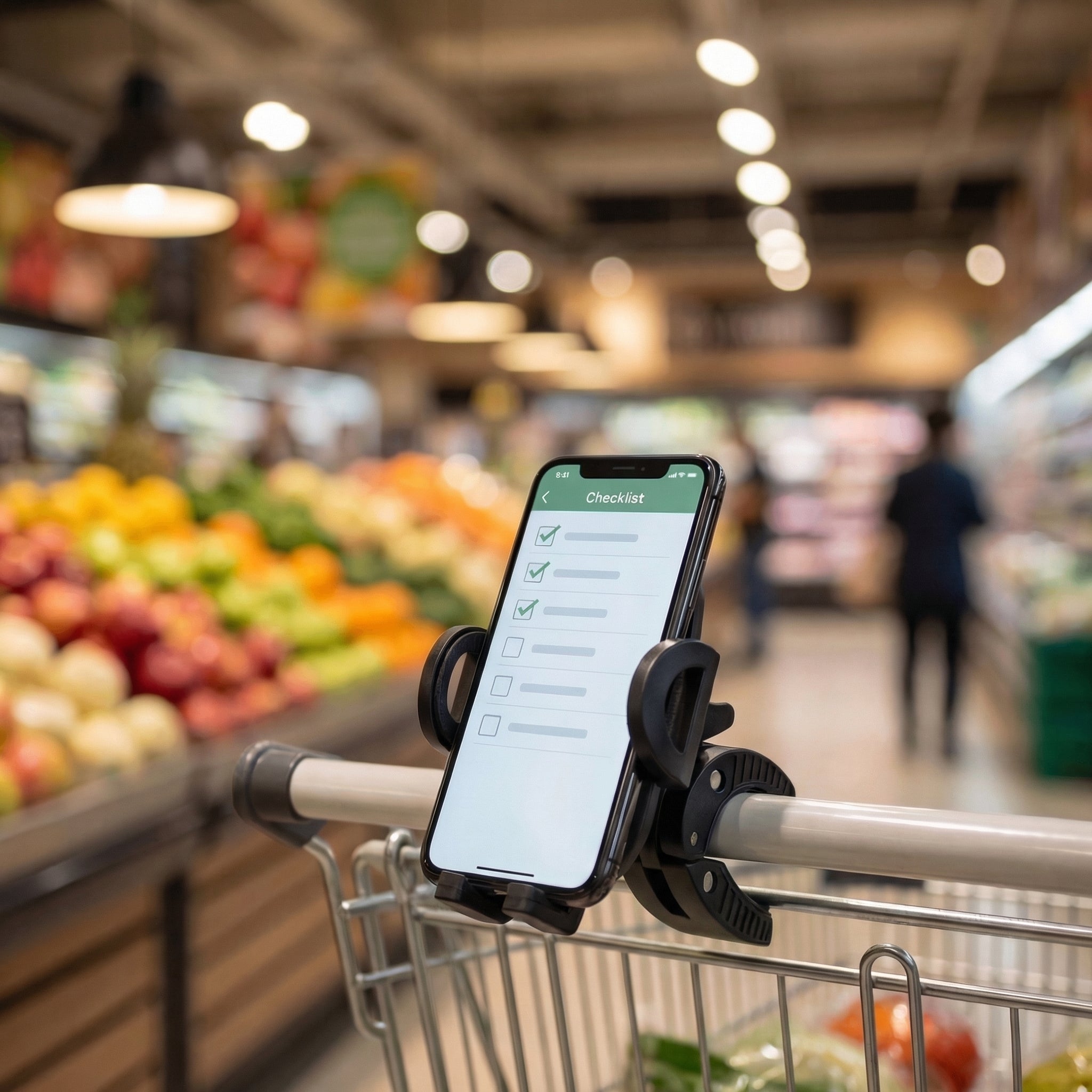 Hands-free shopping in seconds. Clamp it onto your trolley or stroller handle, pop your phone in, and keep your list in view while you shop.